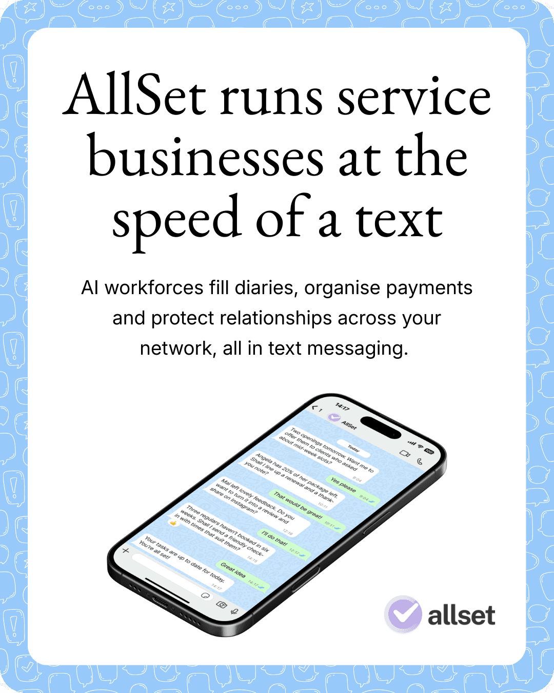 AllSet is designed for you. Our AI-powered workforce runs your business through text messaging so work happens where service already lives.