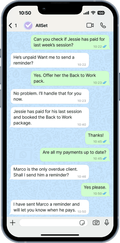 If you want guests to book, change and pay for treatments in a simple chat, AllSet can help. Our AI agents already handle bookings and payments for service businesses in WhatsApp.